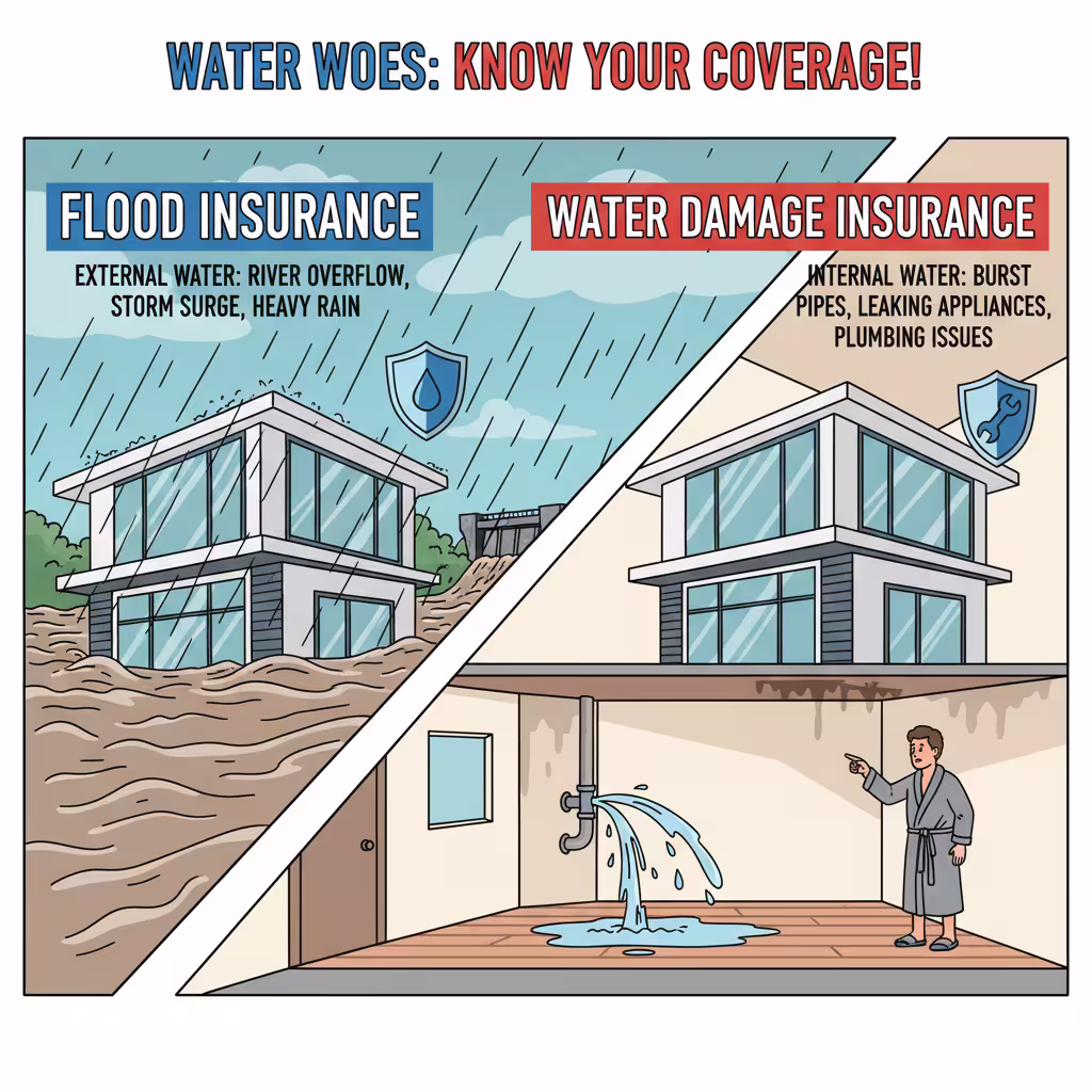 They’re two completely separate products, and mixing them up is one of the most expensive mistakes homeowners make. Water damage — from a pipe, appliance, or storm breach from above — is covered under a standard homeowners policy. Flood damage — from any external rising water source — is excluded from every standard homeowners policy and requires its own standalone flood insurance policy. One does not cover what the other misses. They don’t overlap at all.